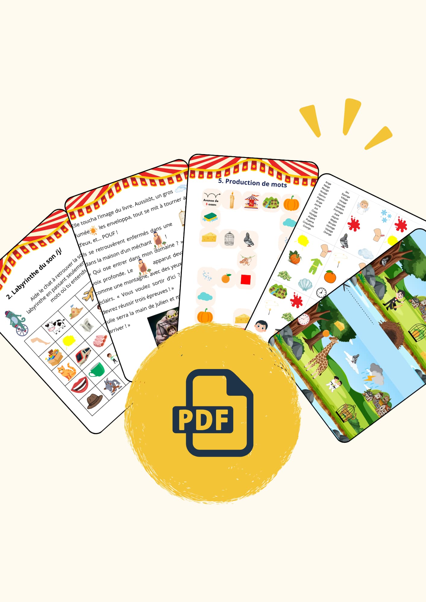 Ceci est un e-book à télécharger : vous recevez un livret PDF de 30 pages à imprimer à la maison. Il a été conçu à partir d’une pratique orthophonique de terrain. Il reprend donc ce qui est réellement travaillé en séance ainsi que les activités souvent proposées aux familles pour poursuivre l’entraînement à la maison.